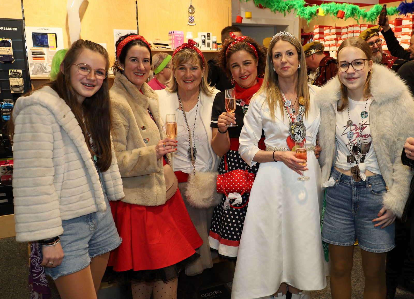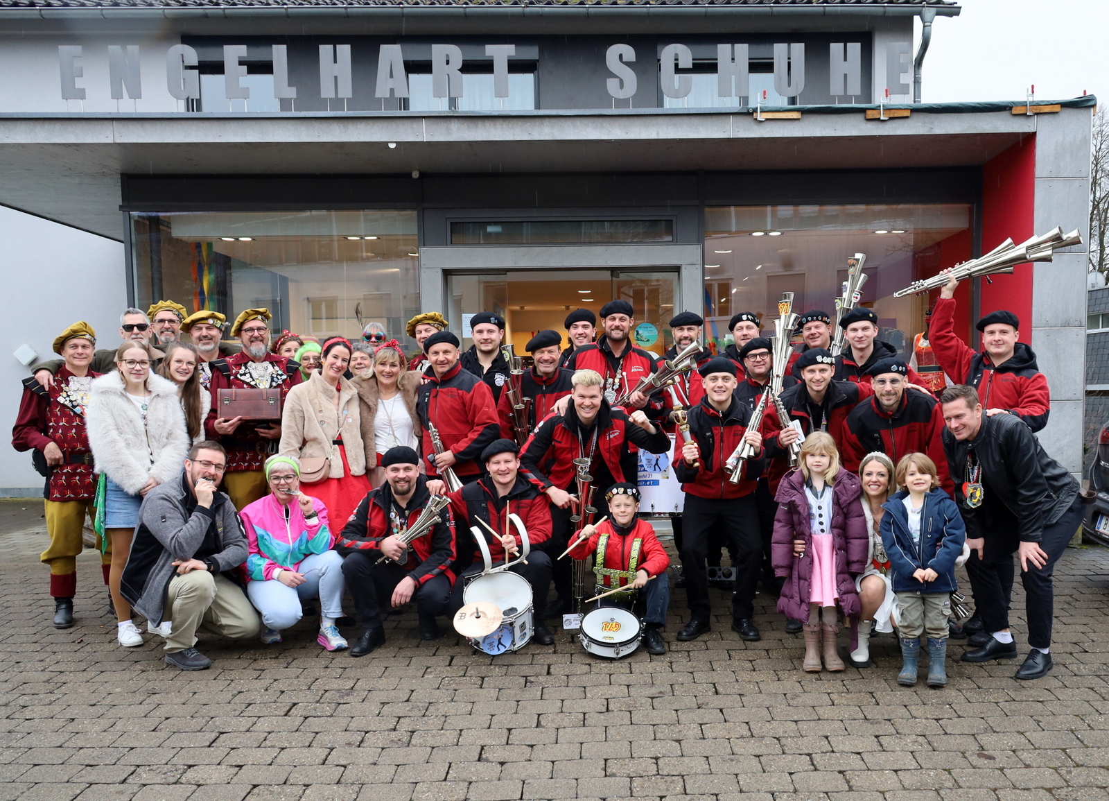 In der Lackiererei Hitzhaus wartete ein besonders närrischer Empfang: Neben dem Firmenchef, selbst ehemaliger Prinz, waren auch drei frühere Prinzessinnen anwesend. Es wurde angeregt über vergangene Faschingssaisonen gefachsimpelt, bevor die Tour weiter zum Schuhhaus Engelhart führte, wo die Gilde seit Jahren herzlich empfangen wird.