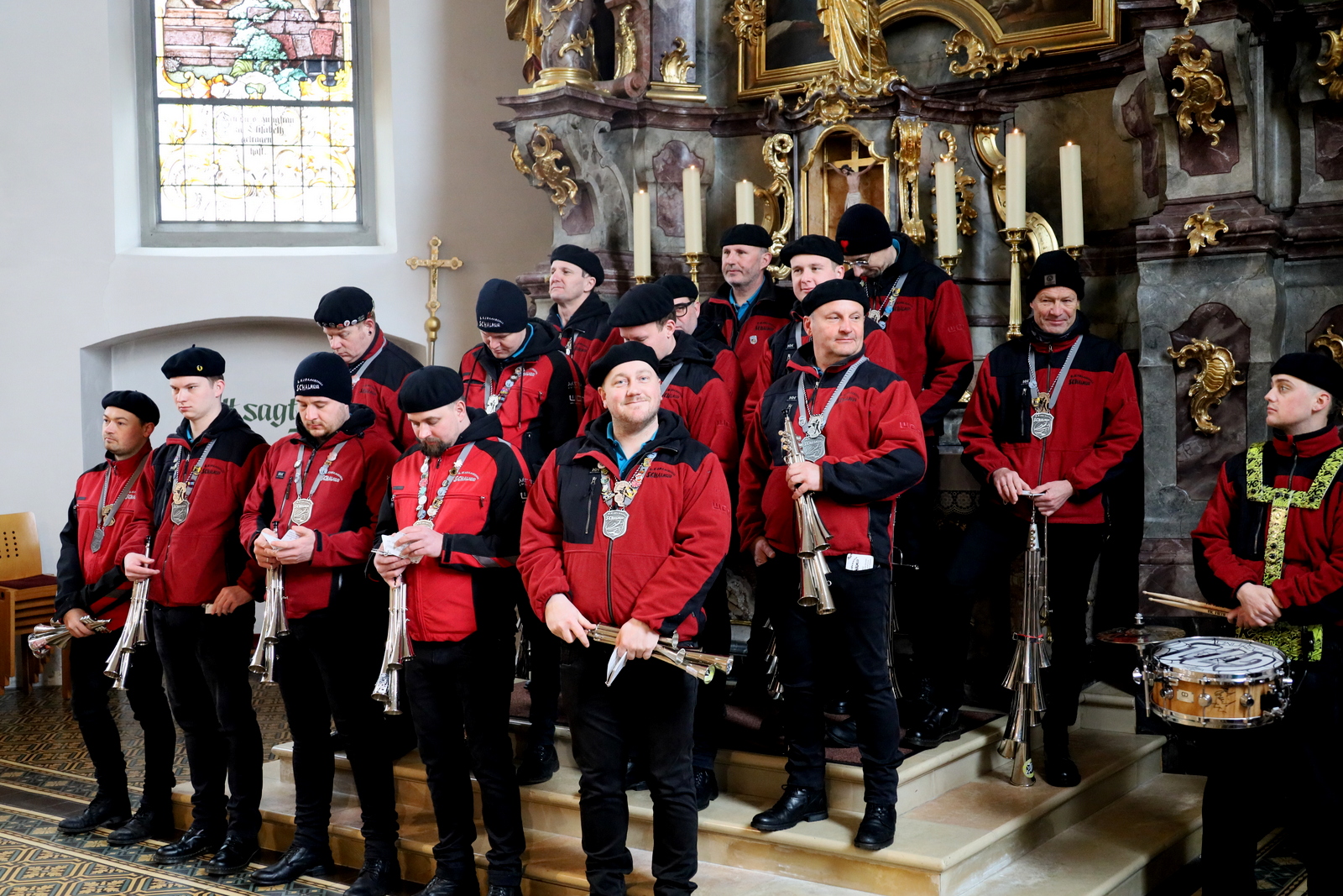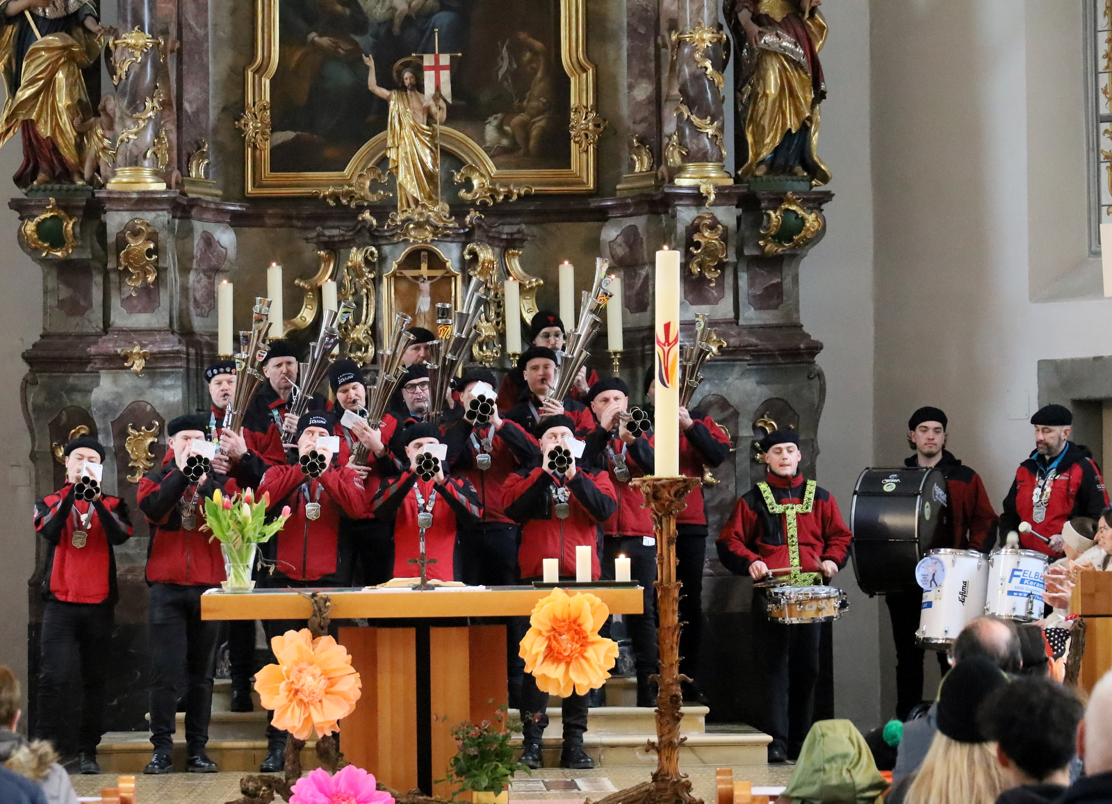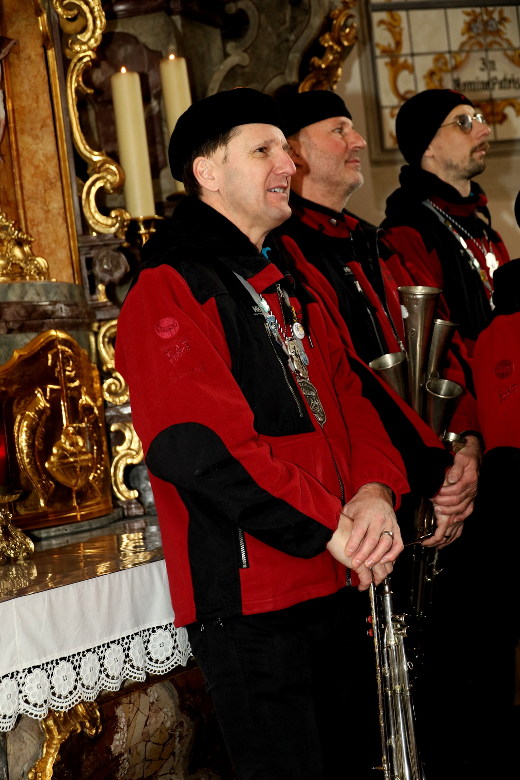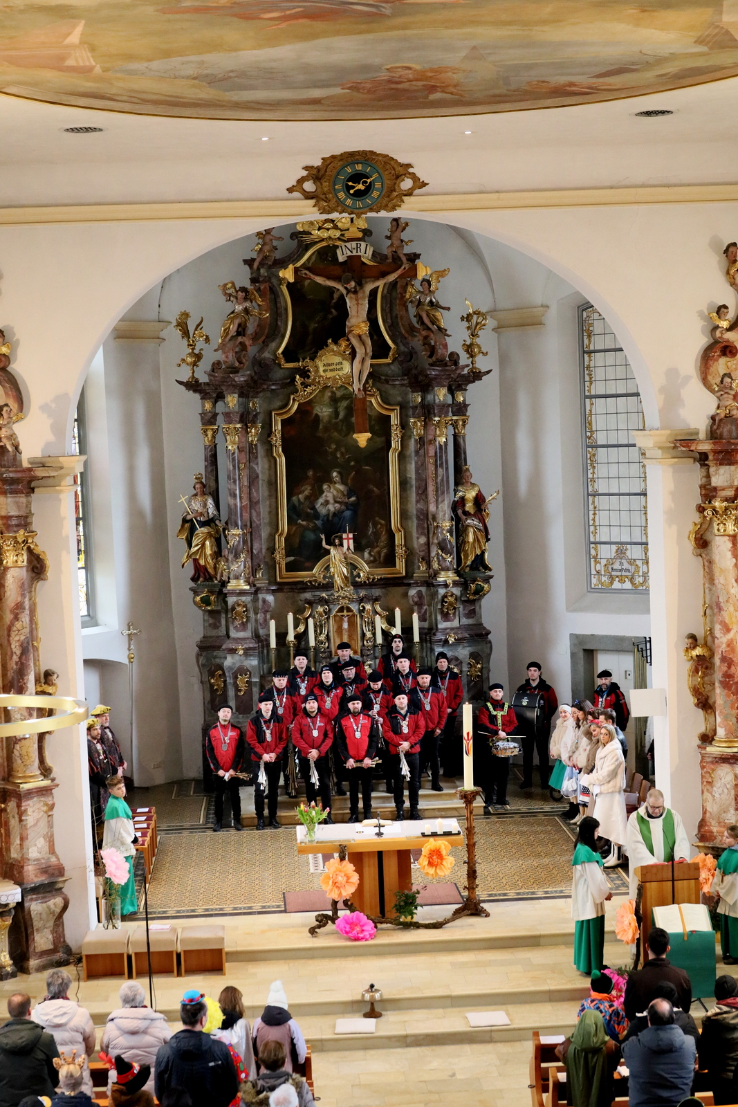 Pater Domenicus durfte zahlreiche maskierte Mäschgerle begrüßen, die gemeinsam mit den übrigen Kirchgängern den Gottesdienst besuchten. Für ungewohnte, aber stimmungsvolle Klänge sorgten die Leiblachtaler Schalmeien, deren musikalische Beiträge die Kirche mit Faschingsgefühl erfüllten. Viele Gottesdienstbesucher klatschten begeistert mit und ließen sich von der besonderen Stimmung anstecken.