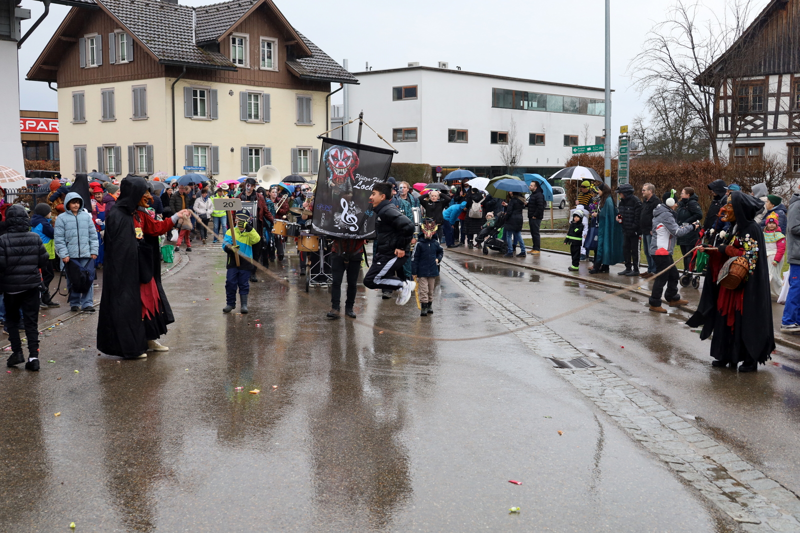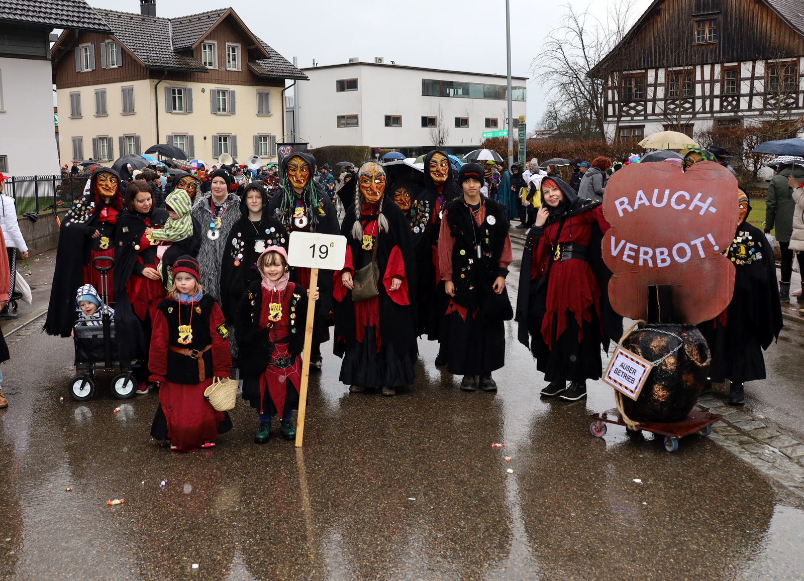 Entlang der Strecke sorgten zahlreiche maskierte und wetterfeste Zuschauer für Stimmung. Mit dabei waren unter anderem das ehemalige Gefolge Simone und Hubert, die Bergerly Hills, die Hochbucher Obsthexen, der Berger Kinderfasching Lochau, die Howilar Rutschbugglar, die Bäumler Zunft Lochau, die Pink Panthers, die Flachshuilar Guggamusik Sonthofen, die Harder Faschingsnarren, die Landjugend Weiler, das Gefolge 48, die Guggamusik Stuabruch Tschäppra, der Kinderfasching Leiblach sowie die Pfütza-Fägar Lochau. Sie alle brachten Farbe ins Grau des Himmels, verteilten „Zuckerle“ und jede Menge närrische Lebensfreude.
